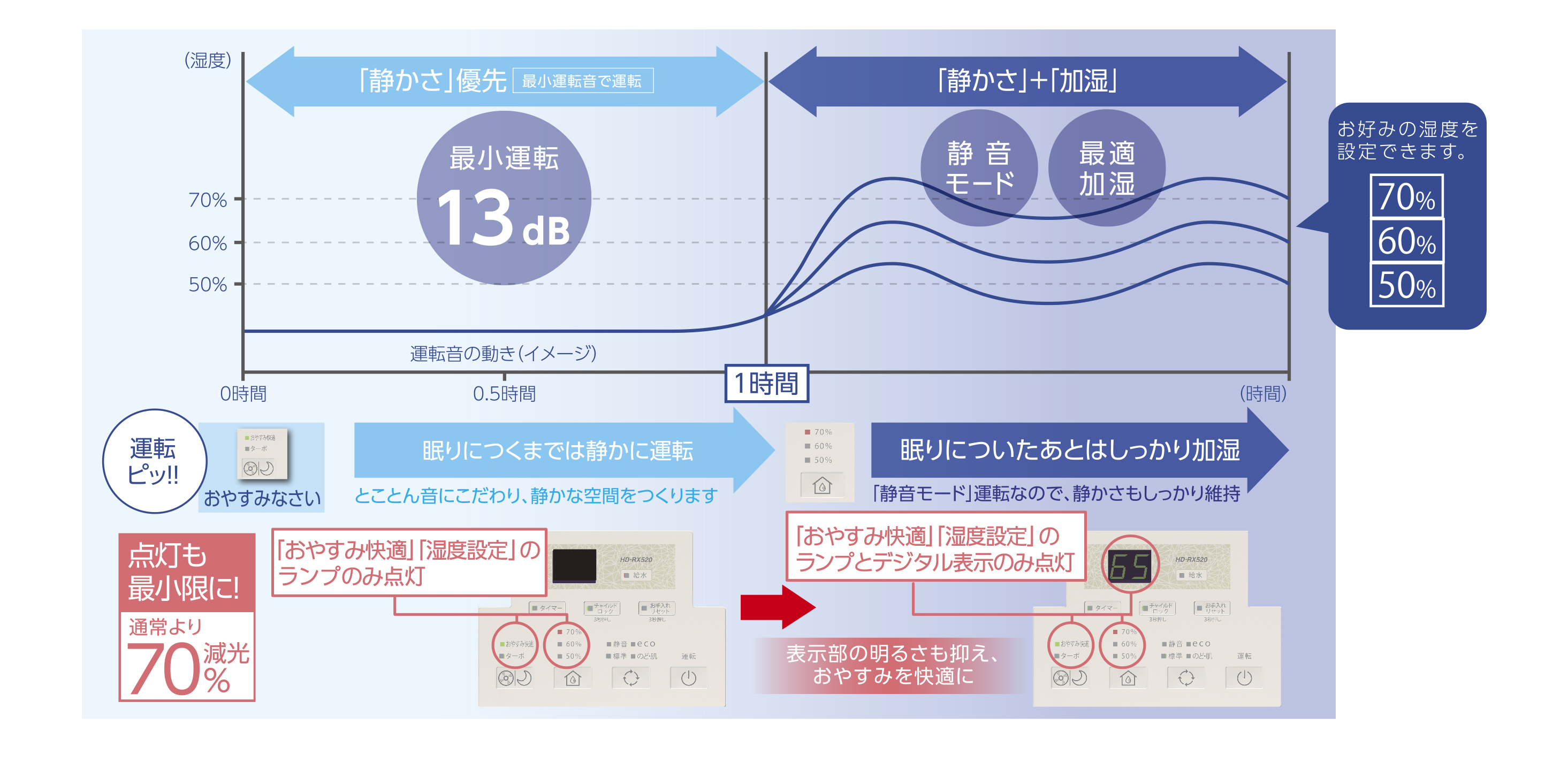 従来の「おやすみ加湿」では、静音モード運転時の設定湿度が50%から変更できませんでしたが、「おやすみ快適」では、50%、60%、70%からお好みの湿度を設定できます。