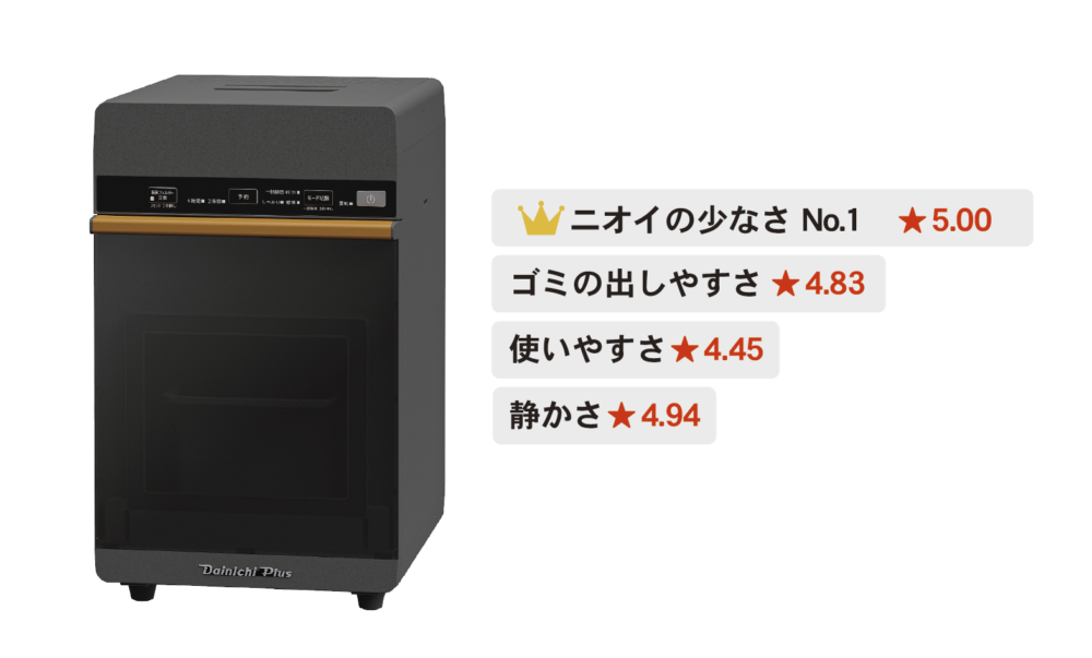 当社の家庭用生ごみ乾燥機 GD-28Aは、【ニオイの少なさ】でNo.1を獲得し、「処理中も処理後もほぼ無臭。稼動音は静かで、ごみ出しも簡単」と高評価。おすすめスコア☆4.82の評価で、全18商品の中で第1位となりました。